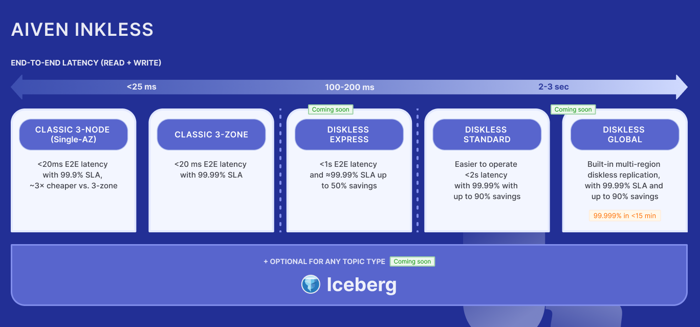 - (soon) Diskless Express: object-store durability with sub-second E2E latency and ≈99.99% SLA