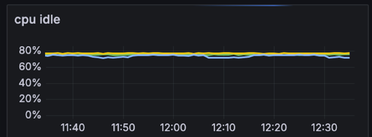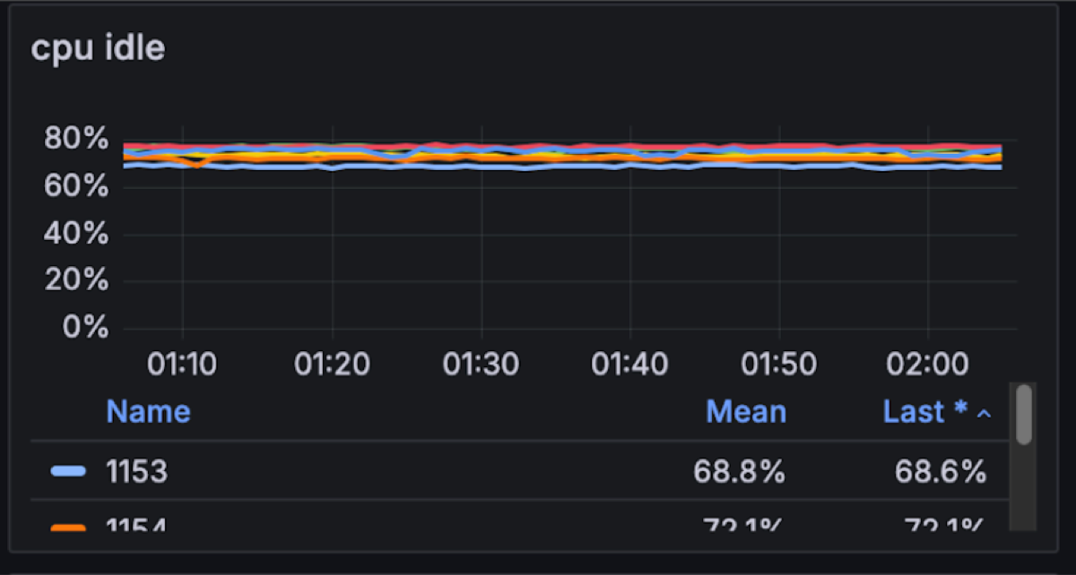 For fun we decided to see what Diskless can do on 50% less compute (3 nodes) in single-AZ and no fan-out, a design that favors such architecture as reads are the most taxing on compute. Turns out in such a scenario Diskless barely nudged the per node resource consumption, compared to a Kafka cluster (which typically needs 9 nodes for this) it is 69% less compute in total.