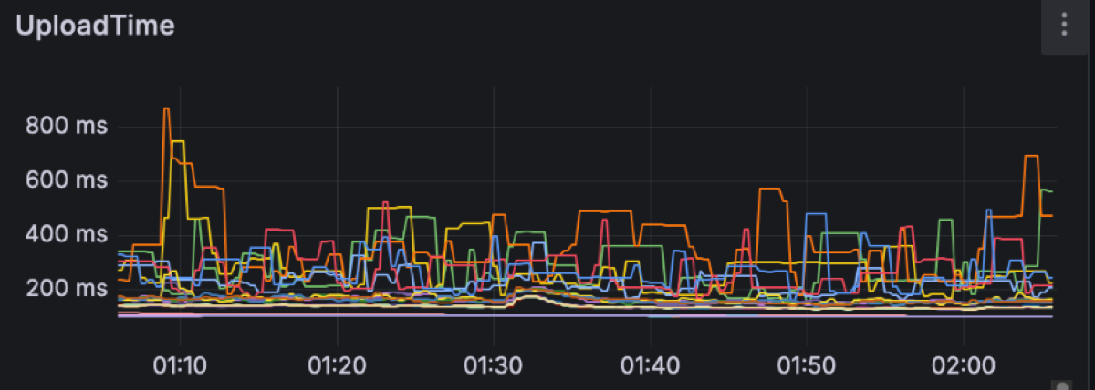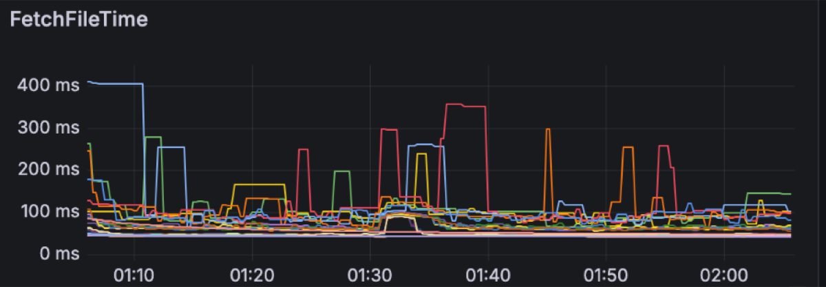This is what the clients see. Let’s move into the broker side and explore the latencies there. We expected object storage operations to be the main drivers of latency. Regular S3 PUT and GET requests can be expected to take a few hundreds of milliseconds. For instance these are the upload and fetch file latencies for this workload, respectively measuring the time it takes for PUT/GET operations to complete: