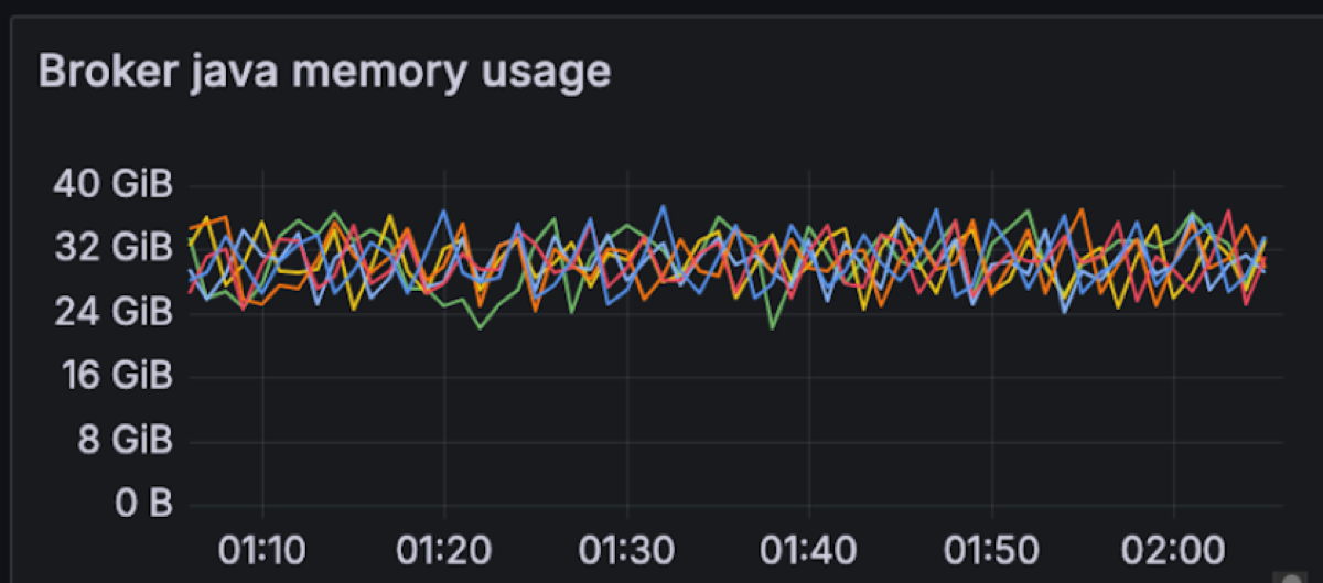 In a classic Kafka setup, brokers are assigned 4-8GB of JVM heap size, but for Diskless this needs to be increased. We are changing this memory allocation to consume ~75% of the available memory per broker for Kafka (48GB) for the JVM heap. This will be shared between Kafka internals and Diskless caches. In this particular test we have 8GBs of memory free for classic and internal topics.