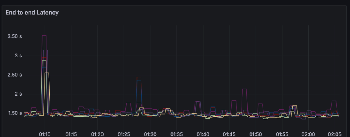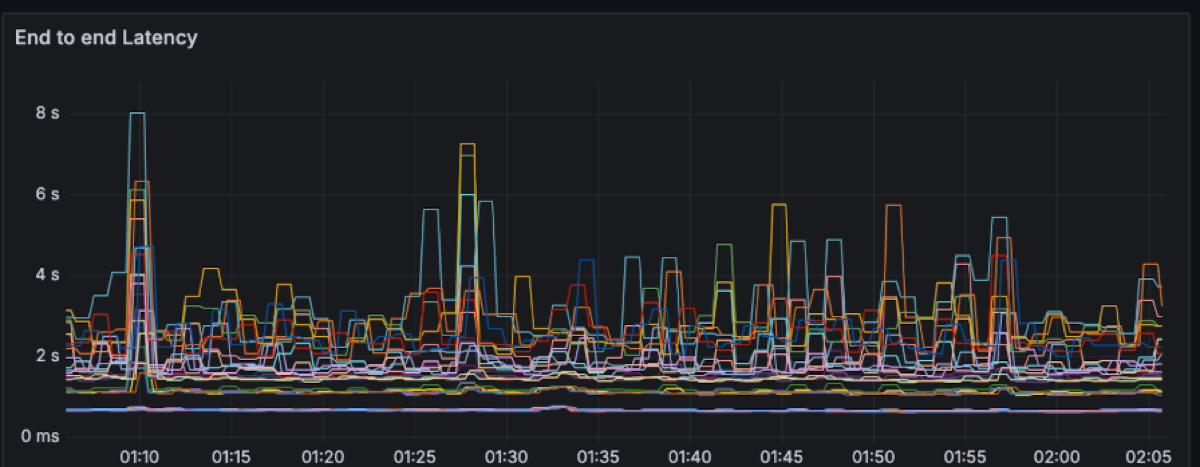 For this workload, the end-to-end latency has a spectrum between ~200 to ~600ms with momentary spikes up to 8 seconds.