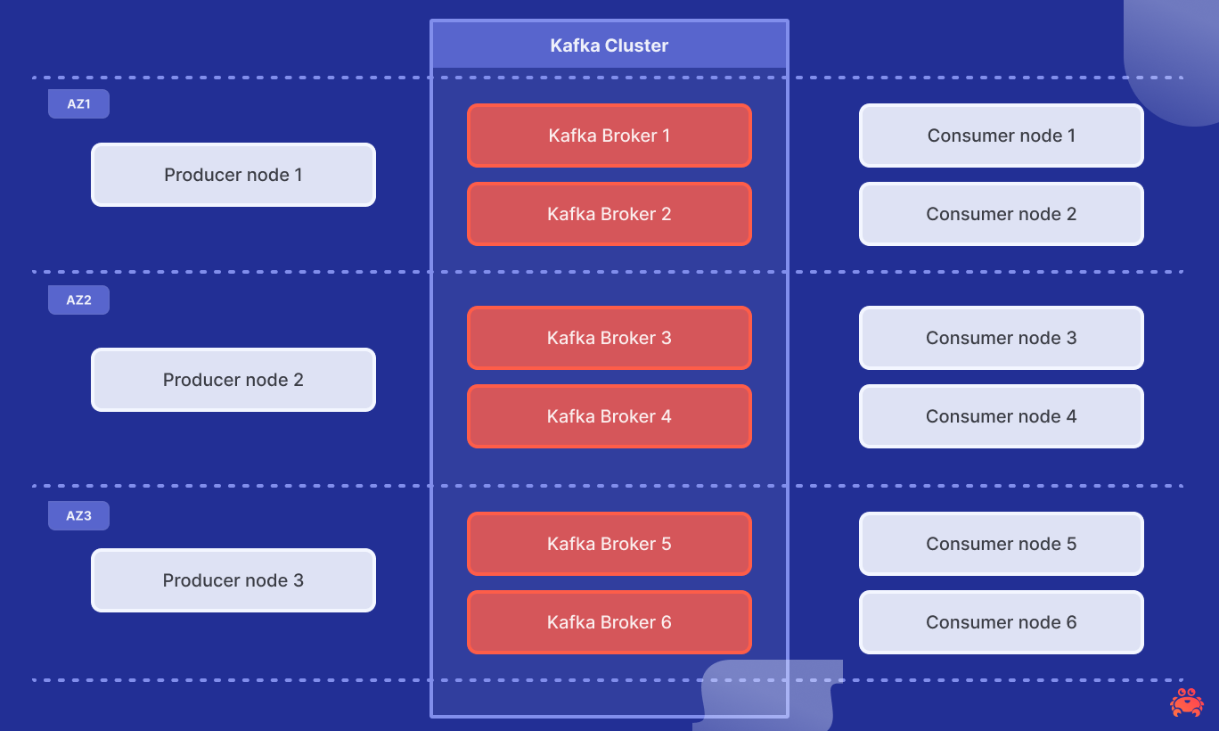 We are using the industry standard OpenMessaging Benchmark (OMB) framework to execute the workloads against Kafka services running on Aiven. Three of the nodes are producers (one per zone), and six are consumers (two per zone).