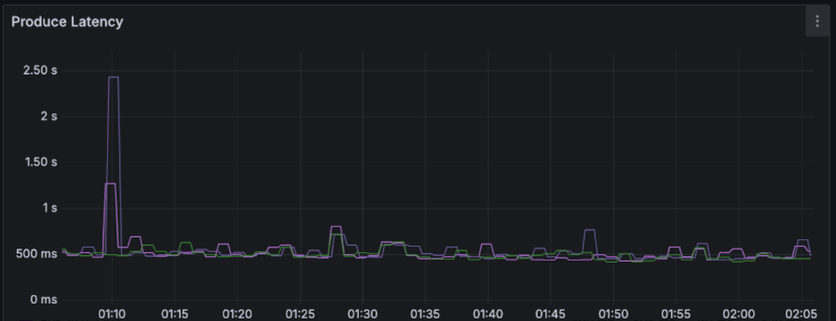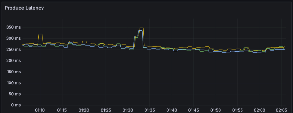 | Produce Latency | P50 is ~250ms, P99 is ~500s |