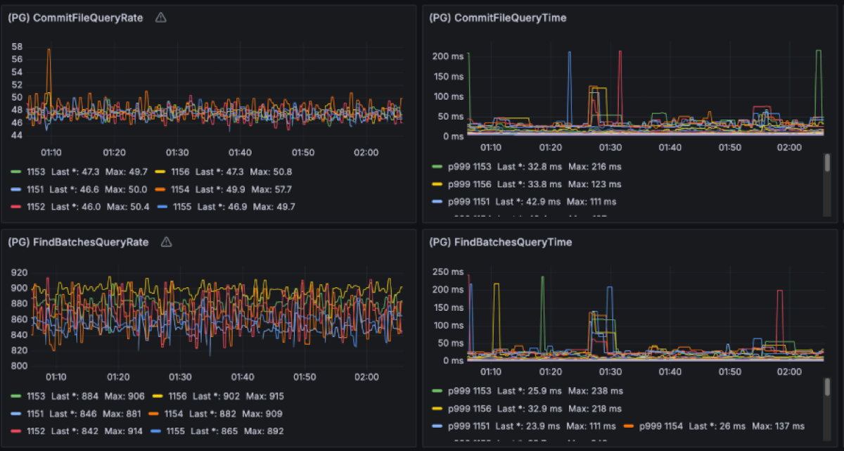 A critical element of Diskless is the Coordinator’s performance. When a broker uploads a mixed file segment to S3, it commits it to the coordinator. These commits happen serially per broker. If the coordinator were to take a long time with one request, it would result in head of line blocking which slows down every other request that was waiting on its turn. Having CommitFile latencies below 100ms has shown criticality to keep performance predictable.