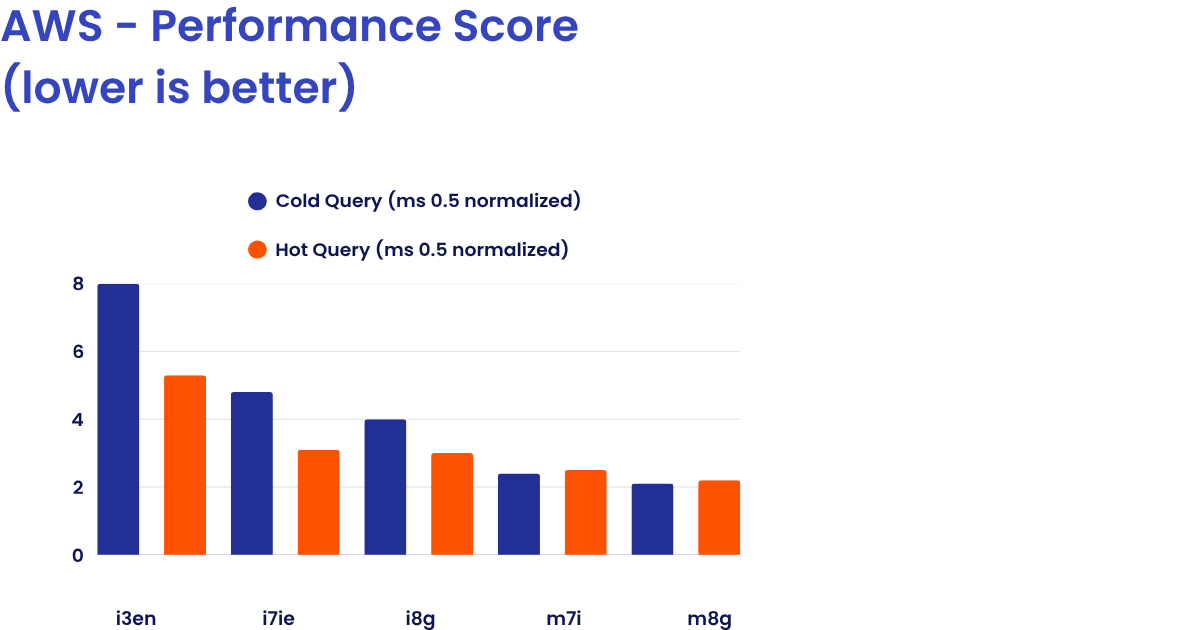 Whilei8ginstances (storage-optimized ARM with attached SSDs) showed excellent cold query performance, the m8g series with EBS emerged as our strategic choice: - Operational Excellence with EBS: The ability to dynamically resize disks to perfectly fit your needs, and enjoy smoother generation upgrades without being tied to fixed, often inconsistent attached SSD sizes is invaluable for a managed service and for our users.