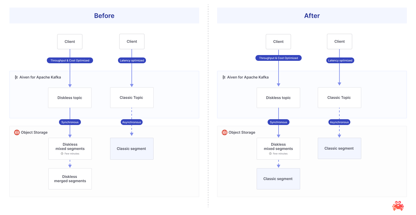 Switching Kafka to Diskless topics becomes real-time - users will be able to flip the topic type, inactivate and upload the active segment, and let new messages flow through the Diskless path. Consumers keep reading at the right offsets; once the last segments drain, on-disk partitions just disappear.