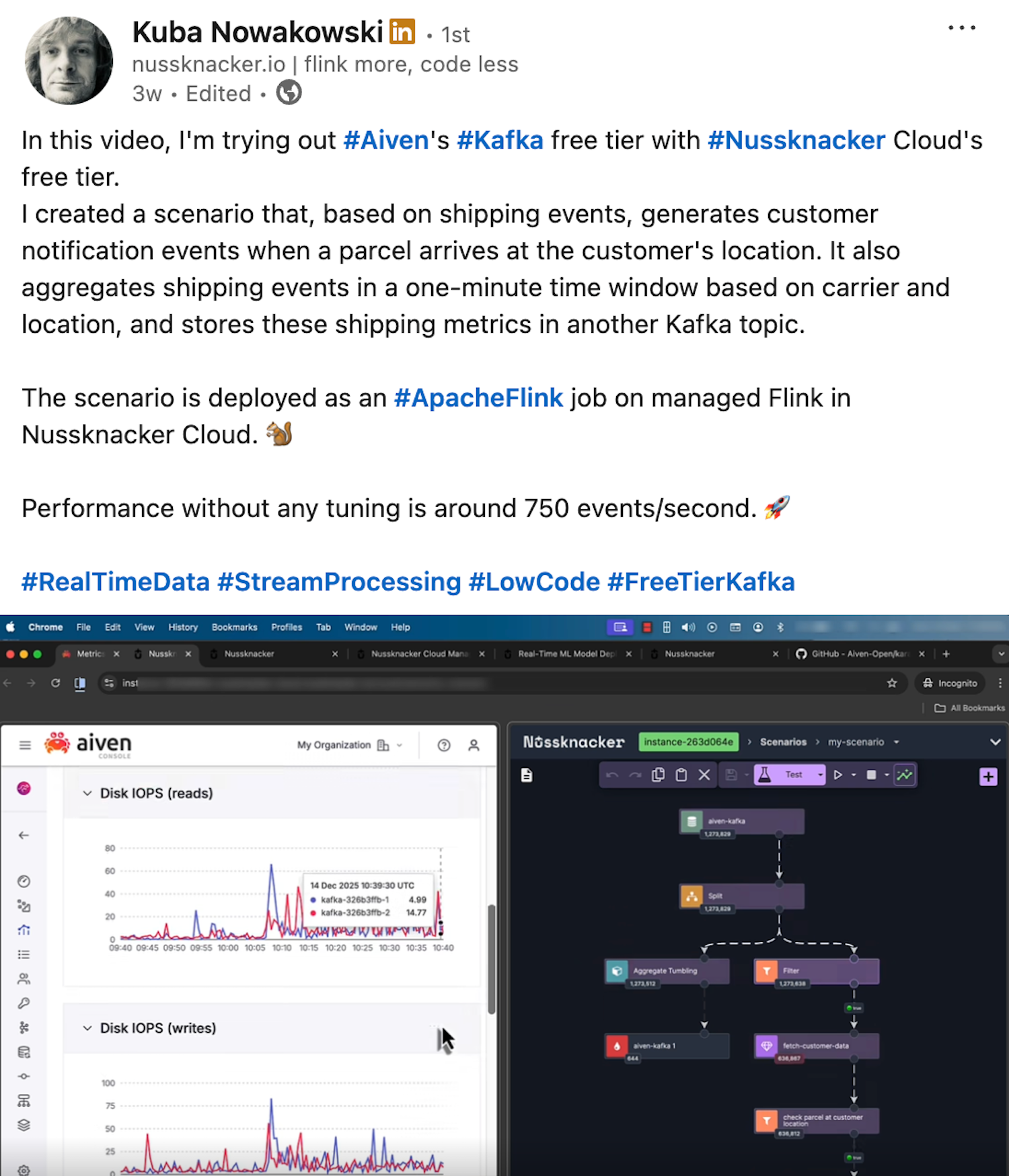 Kuba Nowakowski was the first to submit an entry, and with a slick video demo to boot, showcasing how Kafka and Flink can generate parcel delivery notifications.
