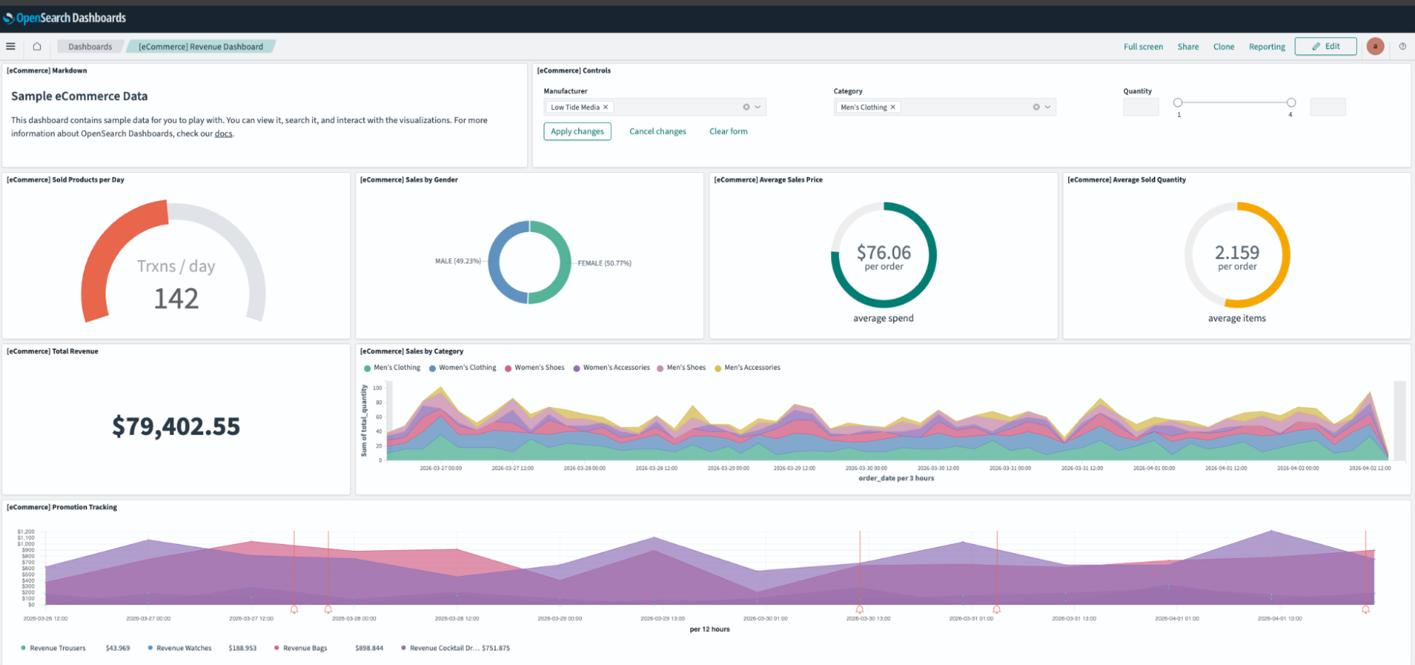 An OpenSearch Dashboards eCommerce overview showing real-time KPIs (transactions per day, average order value, average items per order), revenue trends over time, and promotional funding breakdowns — all built on live data with no separate BI tool required.
