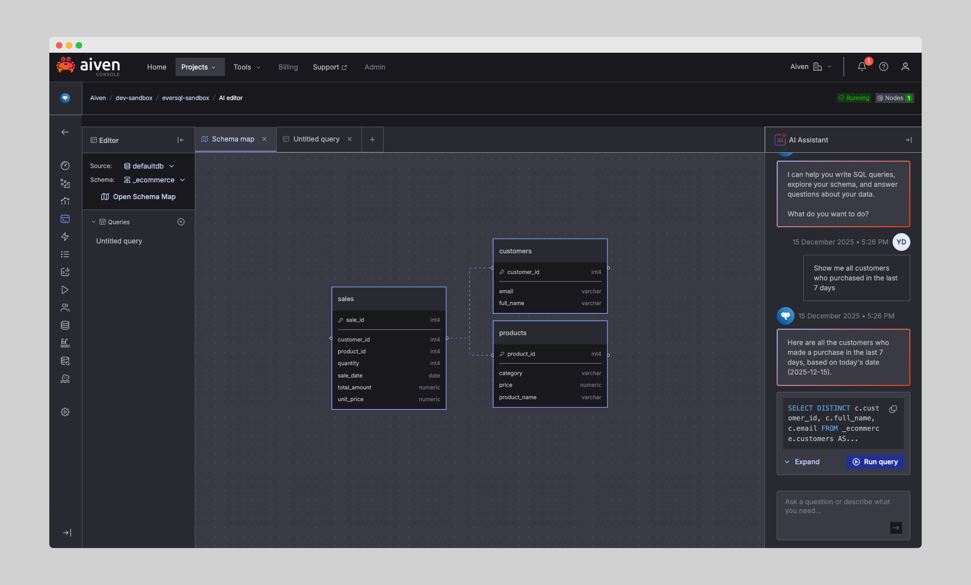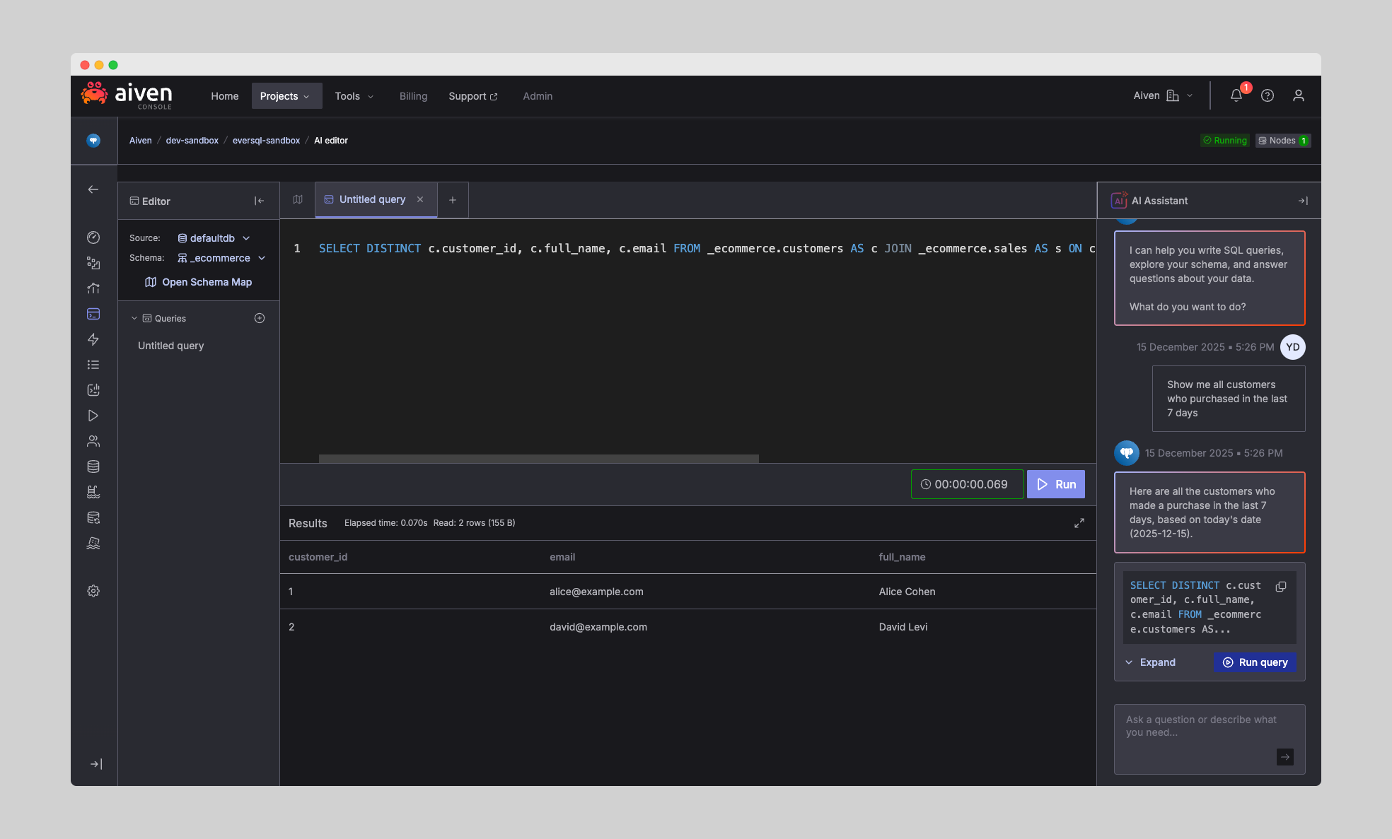 Simply describe what you want - for example, “Show me all customers who purchased in the last 7 days” - and the AI generates a ready-to-run SQL query: