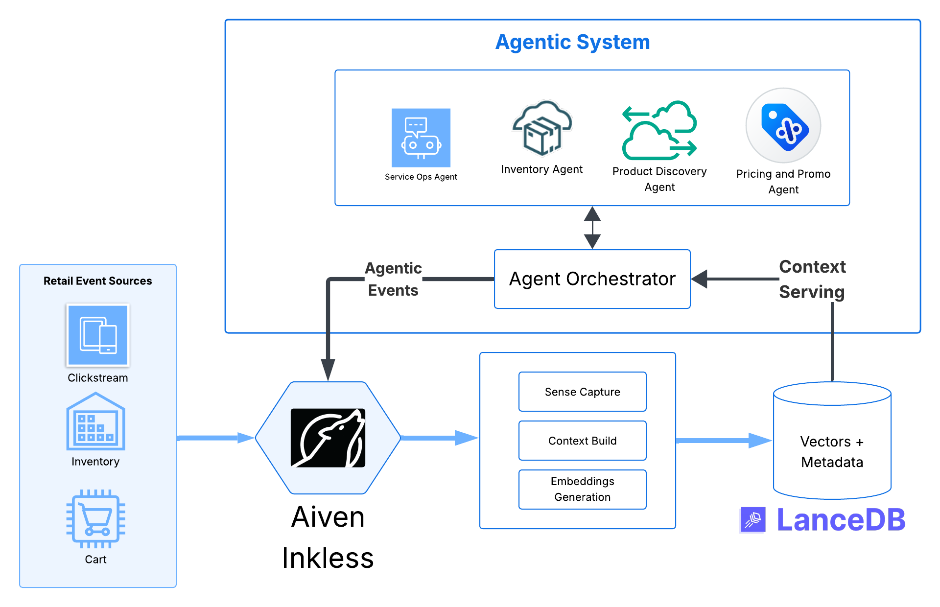Zero-ETL AI: You don't need to move data between a database and a vector store. Aiven for Inkless holds the context, telemetry data and consistent in-motion state. LanceDB stores the raw product metadata (price, SKU, description) alongside the vectors, as well as multi-modal product experience data (images, video, promos, reels etc) simplifying the architecture.
