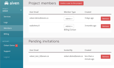 We've also updated project invite functionality to allow inviting users who haven't yet registered their Aiven accounts. Such users are invited to sign up to Aiven and once they've signed up the console will display pending invitations for them. Pending invitations are shown for all users and projects in the console.